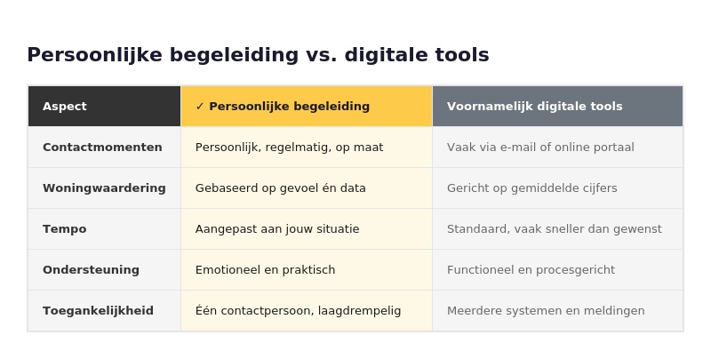 Digitale tools zijn handig maar vervangen geen menselijk gesprek. Een persoonlijke makelaar komt langs, kijkt mee en vertaalt wat je vertelt naar een verkoopstrategie die past. Waar digitale aanpak draait om snelheid, draait persoonlijke begeleiding om vertrouwen en uitleg.