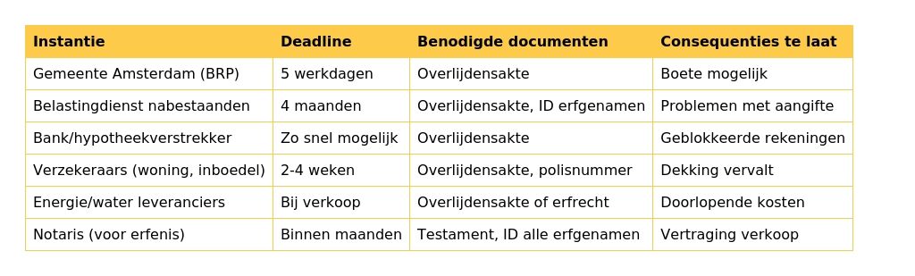 Na het overlijden van een dierbare sta je voor een overweldigende hoeveelheid administratie, zeker als je ook het huis moet verkopen. Je wilt alles goed doen maar weet niet waar te beginnen of wat de deadlines zijn. In dit blog krijg je een concrete checklist van alle instanties die je moet informeren, in welke volgorde dat slim is, en welke documenten je nodig hebt.
